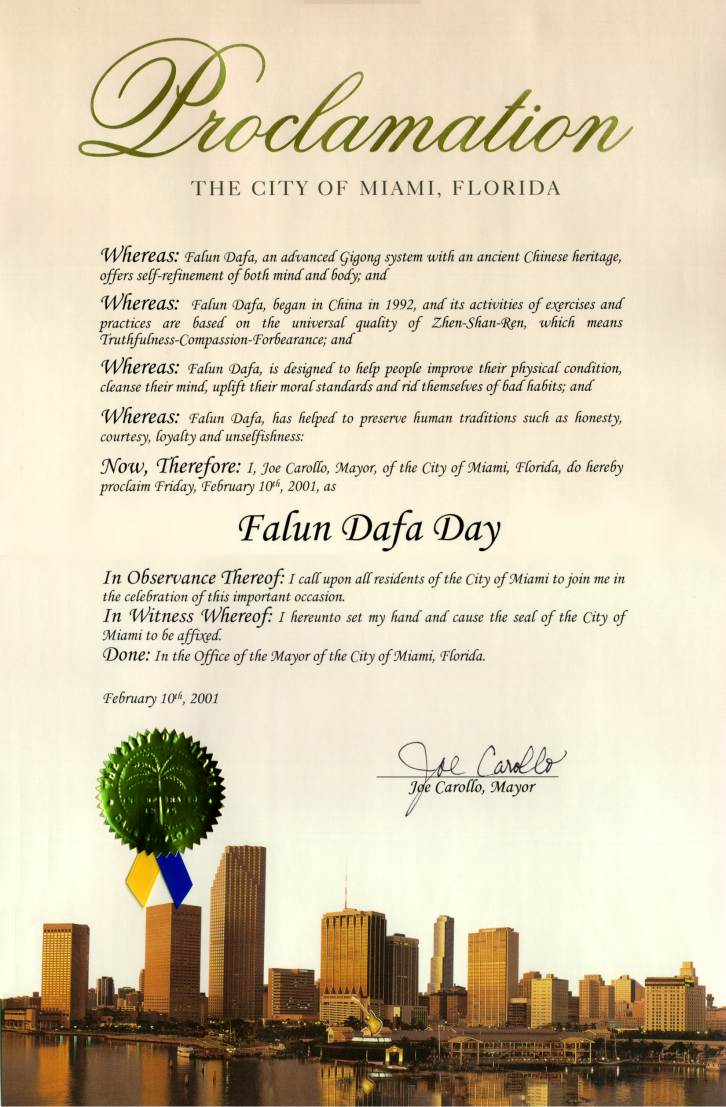 【明慧网2001年2月10日】 佛罗里达州迈阿密市市长宣布2001年2月10日为“法轮大法日”