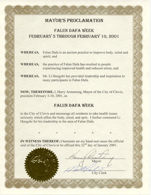 【明慧网2001年2月11日】 加利福尼亚州克楼维斯市宣布2001年2月3-10日为“法轮大法周”。
