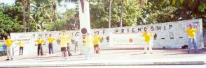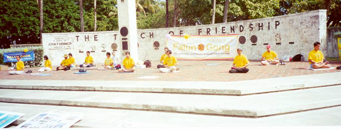 二月的南佛州已是烈日炎炎,学员们在熊熊燃烧的火炬四周一遍又一遍地展示五套功法,广场周围悬挂着法轮大法横幅,并展示了世界各地大法学员炼功图片及中国大陆大法弟子受迫害的图片资料。学员们宁静祥和的炼功场面吸引了许多游人驻足观看。对于大多数西方人来说这还是第一次亲眼所见,亲身接触法轮大法学员,许多人不时地询问着问题,甚至街道上来往的车辆中也时不时有人探出车窗高呼"法轮大法",有几个美国游人还站在学员集体炼功队伍前合影留念。由此可见,法轮大法对世人已不再陌生。