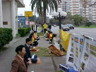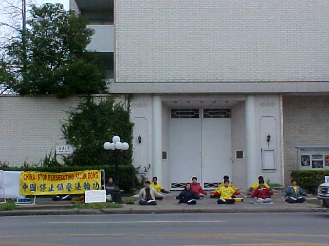 【明慧网2001年2月13日】 二月十一日下午两点三十分,休士顿法轮功学员在中领馆前召开有关澄清自焚真相记者说明会。中领馆前挂了许多横幅,如:中英文写的“法轮大法---真,善,忍”,“中国:停止镇压法轮功”,以及中文强烈要求彻查天安门自焚事件真相,还有各种图片等。休士顿第二十六电视台,第三十九电视台,和英文报社Chronical准时赶来采访,他们记下各种横幅上的中英文,然后采访了部分学员。学员们将早已准备的一些有关澄清自焚的资料递送给这两电视台及报社,学员也回答了他们的提问。数几十名学员向他们展示法轮功的五套动作,任何时候学员们都是以真,善,忍,为修炼原则,反对任何形式的杀生。整个说明会过程中,学员们一直处在祥和、宁静的能量场之中。