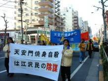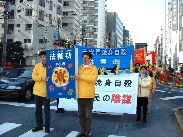 学员们高举《法轮功》书籍模型、被迫害致死的大陆学员的相片和“法轮大法”、“真,善,忍”、“天安门自焚事件是江泽民的阴谋”、“呼吁媒体公正报道”、“呼吁国际社会公正调查”等十几面横幅标语行进在东京这个世界著名的都市大街上。一路上,学员们不断地向行人散发法轮大法特辑的日文报纸。游行历时两个多小时。