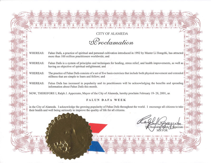 【明慧网2001年2月17日】 加利福尼亚州阿拉米达市市长宣布2001年2月19-28日为“法轮大法周”。