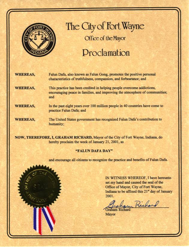 【明慧网2001年2月22日】 印第安那州维恩堡市宣布2001年1月21日为“法轮大法日”