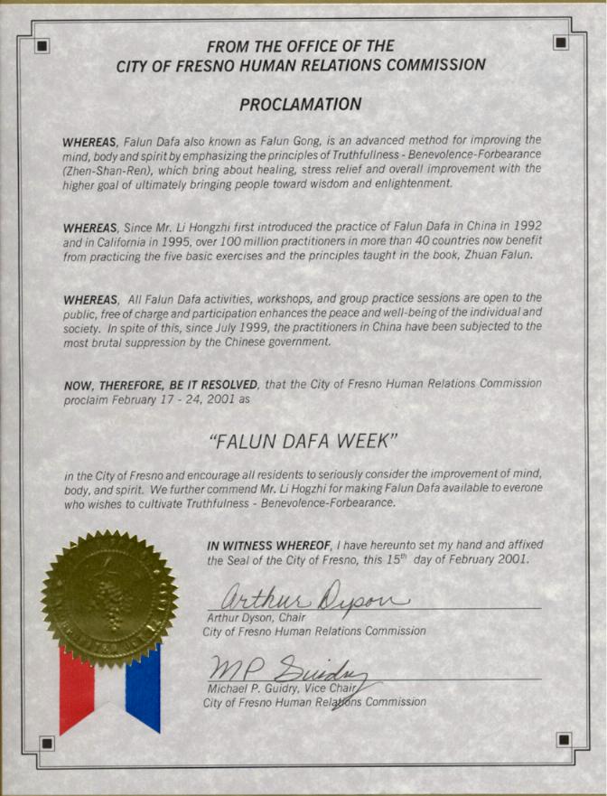 【明慧网2001年2月23日】 加州福雷司诺市宣布2001年2月17日至24日为法轮大法周