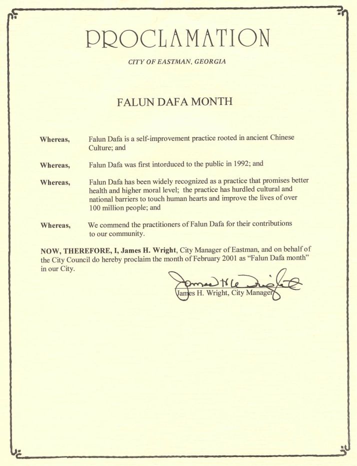 【明慧网2001年2月24日】 佐治亚州东方人市宣布2001年2月为“法轮大法月”
