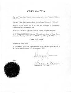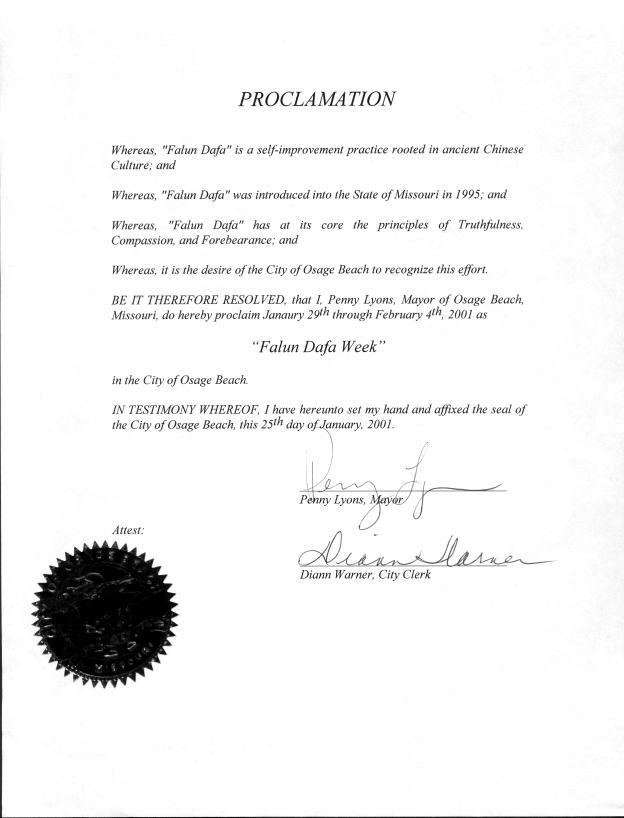 【明慧网2001年2月25日】 密苏里州奥萨格滨市市长宣布2001年1月29日至2月4日为“法轮大法周”