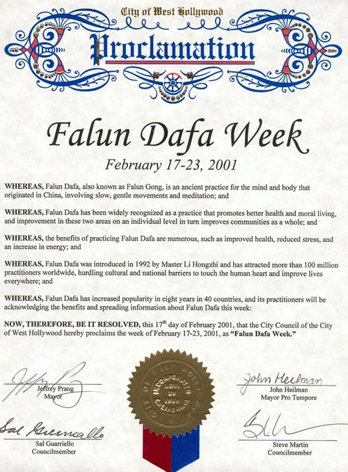 【明慧网2001年2月26日】加利福尼亚州西好莱坞市宣布2001年2月17日为“法轮大法周”
