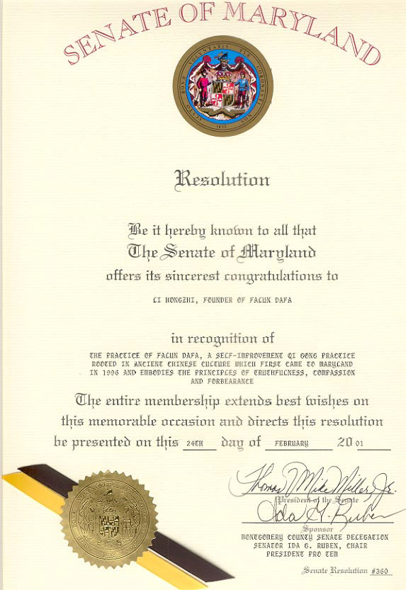 全体马里兰州参议院议员,在2001年2月24日这个特别值得记忆的日子,给予法轮功最美好的祝贺。