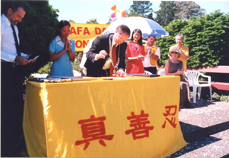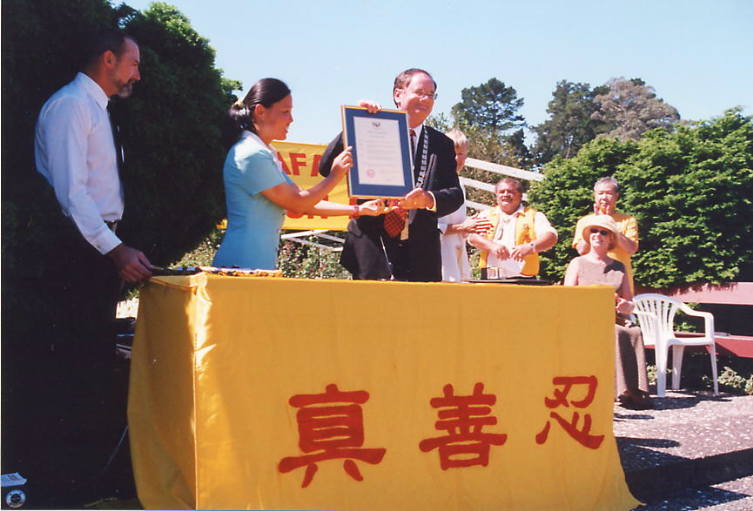市长先生在听取了部分大法学员的修炼体会,观看了学员们展示的法轮大法五套功法之后,高度赞扬了法轮大法,当场签发证书,宣布2001年2月24日为汉密尔顿市法轮大法日。之后市长先生接收了学员们赠送的英文版《转法轮》。这是新西兰的第一个法轮大法日。褒奖令的授予,向世人展示了法轮大法正在得到愈来愈多的人民及政府的理解和支持。