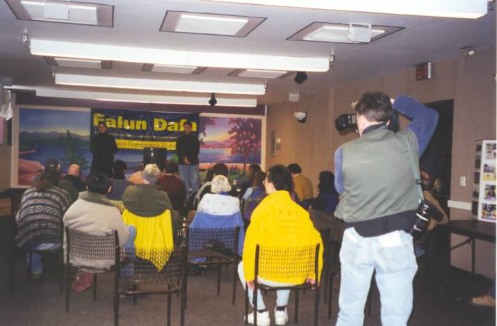 | 伯林顿自由新闻社的摄影记者在为我们摄影 | 播放大法介绍录象及"法轮大法-真实的故事"录象 |