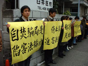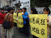 今天上午10时至下午2时,日本法轮功学员20多人又前往中国驻日使馆请愿,他们举着“自焚骗局是陷害法轮功”、“停止镇压迫害法轮功”、“邪恶疯狂天地不容”等中日文横幅,学员就中国大陆媒体报道的多个疑点,呼吁国际机构对天安门广场自焚事件进行独立调查,将真相大白于天下。