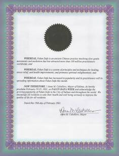 【明慧网2001年3月1日】 加州萨立那市宣布2001年2月19日-25日为“法轮大法周”