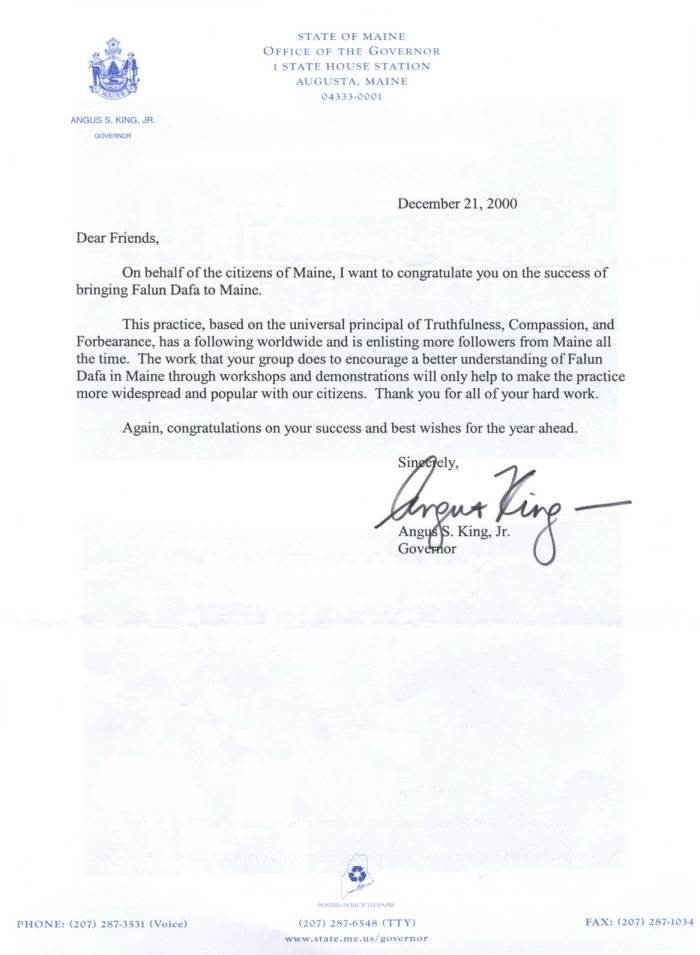 【明慧网2001年3月1日】 缅因州州长小奥古斯.S.金(Augus S King Jr.)2000年12月21日致法轮大法学员的褒奖信