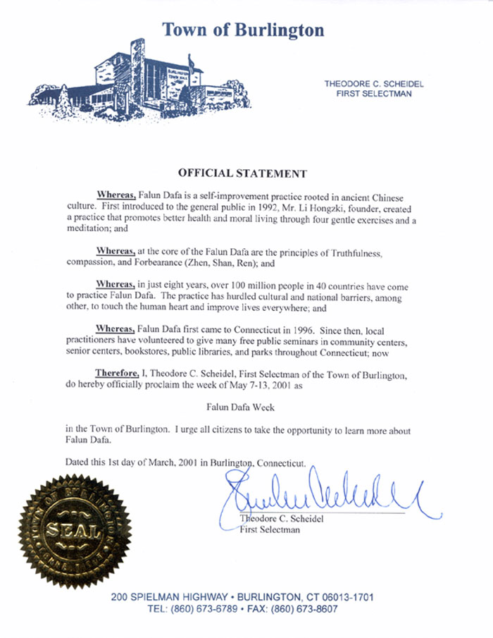 【明慧网2001年3月10日】康涅狄格州伯灵顿镇宣布2001年5月7日-13日为“法轮大法周”