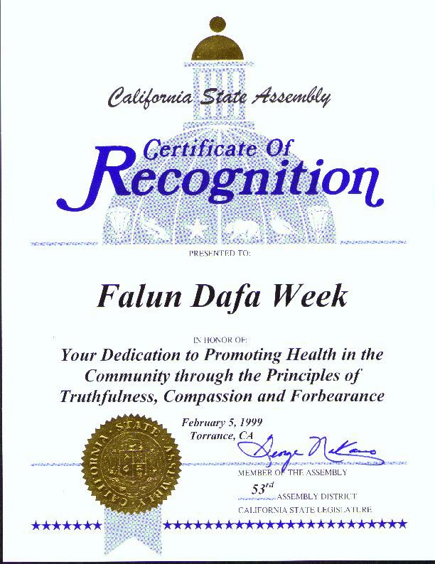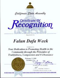 【明慧网2001年3月12日】加利福尼亚州州议会第53选区议员于2001年2月5日褒奖“法轮大法周”。