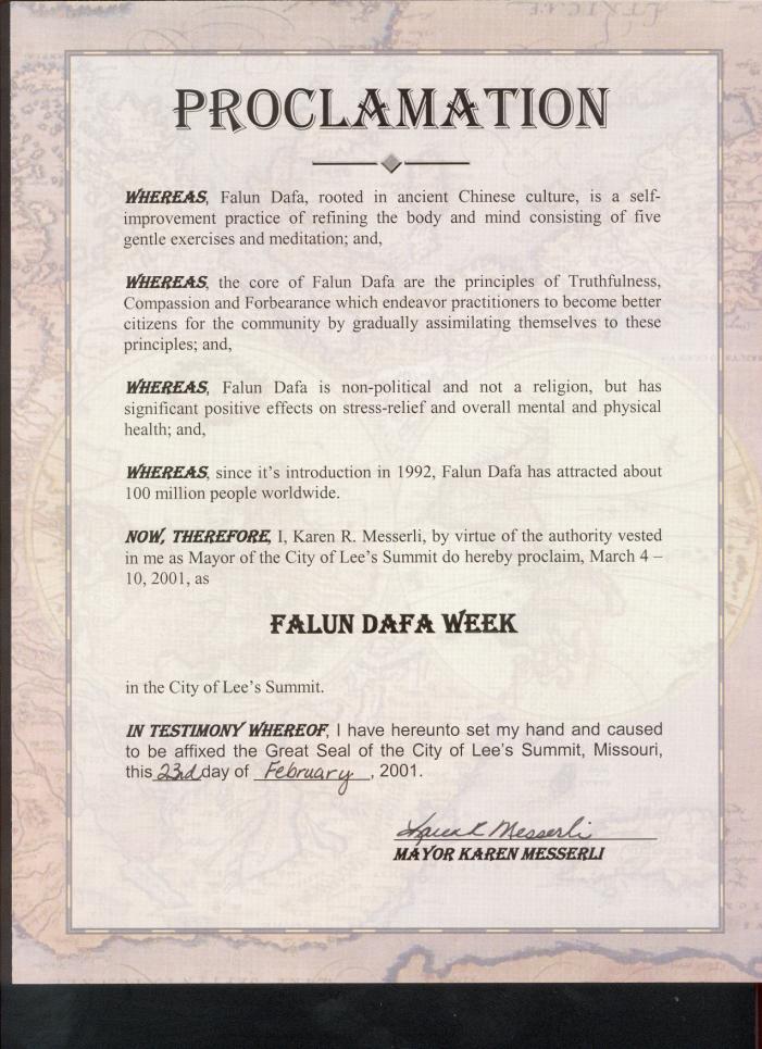 【明慧网2001年3月14日】 密苏里州李高峰市宣布2001年3月4-10日为“法轮大法周”