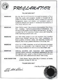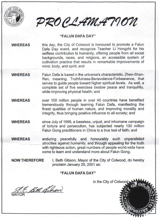 【明慧网2001年3月18日】 加拿大不列颠哥伦比亚省库伍德市宣布2001年1月20日为“法轮大法日”