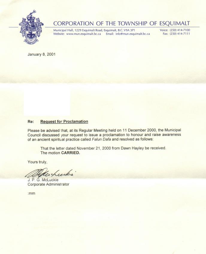 【明慧网2001年3月18日】 加拿大不列颠哥伦比亚省艾斯昆茂镇通过决议褒奖“法轮大法”