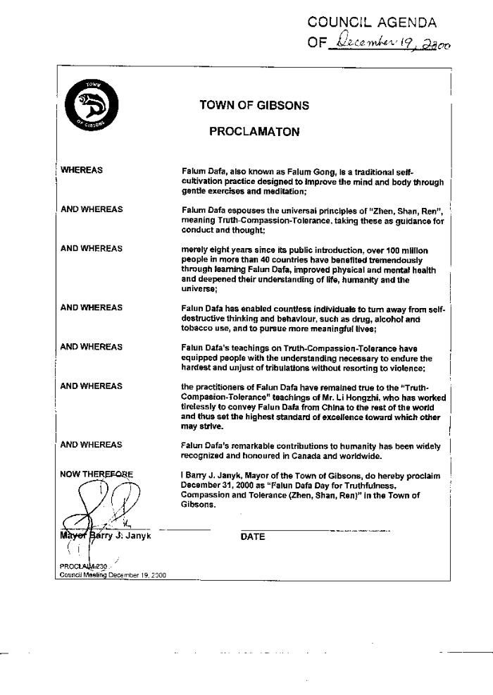 【明慧网2001年3月18日】 加拿大不列颠哥伦比亚省吉布斯镇宣布2000年12月31日为“法轮大法真善忍日”