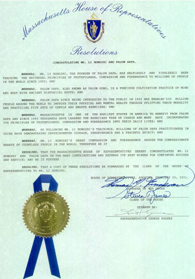 在此麻萨诸塞州众议院褒奖李洪志先生和法轮大法,并真诚的祝愿你们幸运和继续取得成功。