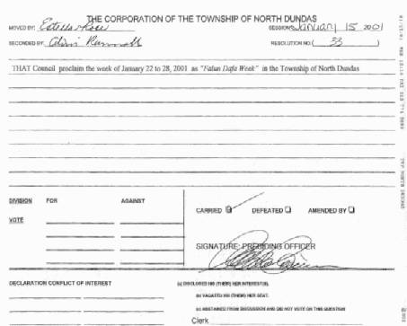 【明慧网2001年3月6日】 加拿大安大略省北当达斯镇宣布2001年1月22-28日为“法轮大法周”