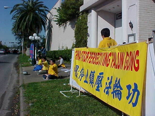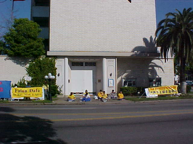 【明慧网2001年3月7日】中国近日打压法轮功不断升级,又正值中国北京正召开全国人大会议之际,休士顿大法弟子于三月四日下午两点半钟前往中领馆前请愿。他们带去一些关于呼吁“中国:停止镇压法轮功”的条幅,以及法轮功学员被的图片等多种资料。他们也邀请了一些中文媒体参加,让媒体知道近日中国迫害法轮功情况,并且希望所有人大常委委员能给予法轮功学员有习炼法轮功的权利及环境。大法弟子展示了法轮功的五套功法。路人纷纷了解法轮功被迫害的情况,其中一位中年美国男士知道在中国没有信仰自由,没有习炼法轮功的自由,他对此极为气愤,他跑到中领馆对面,对中领馆大声说道:“我支持法轮功!”还有一位中年男士表示,我一直支持到你们成功为止。还有路人要求参加法轮功的免费教功及大法介绍班。