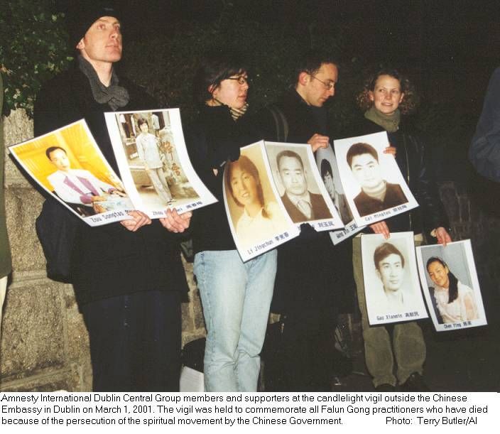 三月的一个寒冷的晚上,30人参加了在中国使馆外面举行的烛光守夜活动,纪念1999年7月此精神运动受到镇压以来已经死亡的150多名法轮功修炼者。感谢所有到场的人们,包括国际特赦组织的其它团体和支持者们。感谢戴和鲍为我们拍摄出色的照片。