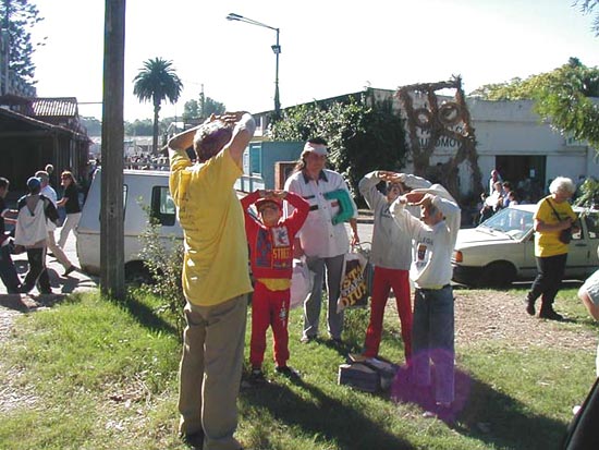 刚到蒙得维的亚,一小队修炼者就赶到一个深受乌拉圭各层人民喜爱的公园及展览中心。它供当地的人们在这里休息,玩耍,和家人共度时光。我们请求允许向人们展示五套功法并说明法轮大法活动总是免费的。他们爽快地答应了我们的请求并帮助我们找到一个稍微安静一点的地点。这天剩下的时间我们就不断地炼功,一遍一遍地展示五套功法。我们多数人炼功,另一些人分发法轮大法的资料并对功法作说明解释。公园里大多数的人不等我们给他们传单就主动向我们了解情况。在我们到访的拉美国家中,乌拉圭的人民算是非常友好,真诚和敞开心扉的。