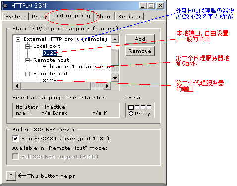 *安装下载的httport3sn.exe,然后在运行时先会弹出一个窗口,讲解功能,可看后选择CLOSE 就可以进入设置界面如图(1)