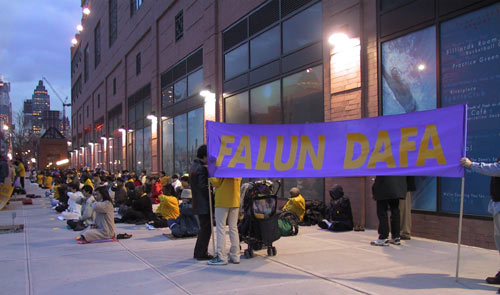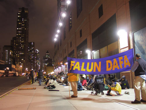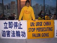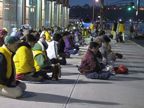 法轮功发言人说:“我们强烈要求中国政府立即停止对法轮功的残酷镇压。我们选择今晚是为了呼应正在日内瓦召开的人权会议。明天一些联合国成员将就通过批评中国人权状况的决议案开始讨论。所以全世界的法轮功学员将于今晚在世界各地举行烛光守夜。”