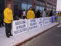 这次活动的主题是“行动起来,制止屠杀”以及“呼唤人道主义援助”。学员们打出了许多横幅,如“法轮大法是正法”、“出卖国土,镇压无辜,人神共愤”、“法轮大法好”、“江泽民血债累累,难逃历史的审判”、“江泽民政府停止迫害法轮功”等等。安放在正中间的是一个洁白的花圈,上面有190位死去学员的照片和名字。许多驶过的美国人纷纷以汽车鸣喇叭的方式表示对我们的赞许和支持。不少学员向过往行人征集签名,许多人在简单询问之后就爽快地签了名,使这个世界又多了一个有希望和未来的善良人。