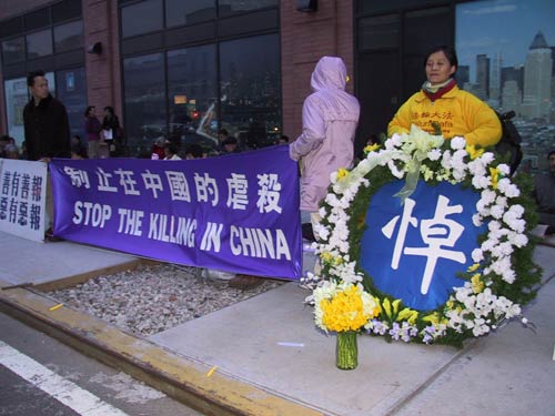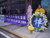仅仅因为相信法轮功的三项原则“真、善、忍”,他们就被杀害了。他们中的每一位都是江泽民对法轮功的猛烈打压――一场猖獗的,还在不断加剧的反人类罪行――的受害者。我们震惊于中国的领导人如此肆无忌惮地无视人权和自己的宪法。我们今天是在这里纪念这些温和、无辜的生命的逝去。我们不会忘记在中国发生的事情的真相。中国的江泽民主席拆散了无数的家庭,扰乱了无数的社区,挑起了人民之间的仇恨。