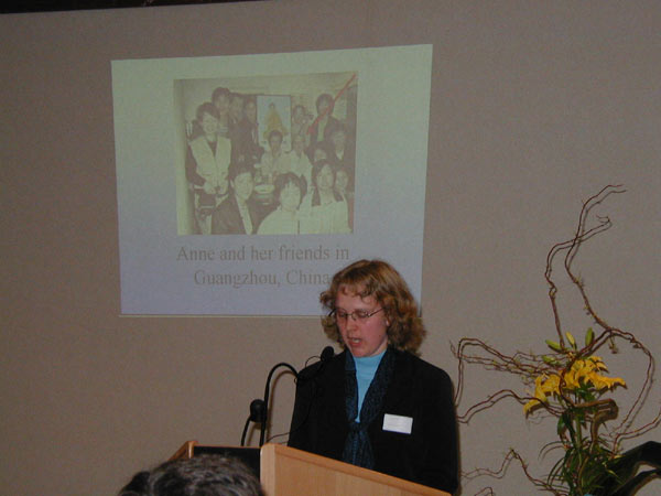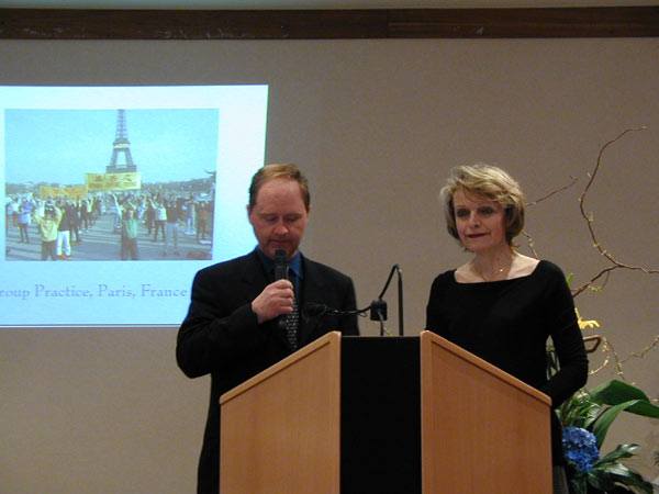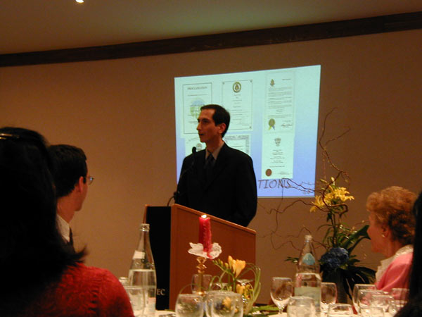 招待会上,来自欧洲、澳洲、亚洲、北美的四名学员分别代表所在各洲的法轮功学员向所有在压力下、在中国人权最差的困难时期,为在中国遭受迫害的法轮功学员呼吁并提供帮助的组织与个人表示了真诚的感谢。代表亚洲各国学员的台湾代表通过图片向与会者介绍了法轮功在台湾政府与公众的支持下蓬勃发展的情况。并同中国目前的残酷镇压做了对比。台湾学员代表张先生特别指出:台湾与中国大陆有着共同的文化背景,相同的文化渊源,因此来源于中国传统文化的法轮功在台湾受到了极大的欢迎。在过去的一年中,仅炼功点的数量就从300个猛增至600个。“饮水思源”,生活在自由、和平环境下的世界各国学员就更加关注中国大陆学员的处境与遭遇。