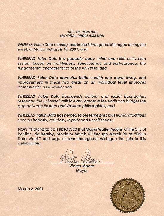 【明慧网2001年4月21日】 密西根州庞地亚克市宣布2001年3月4-9日为“法轮大法周”。