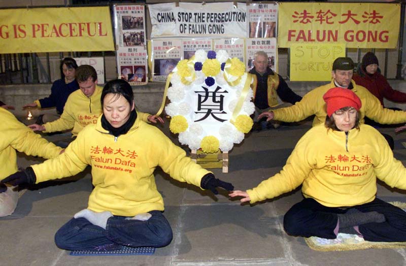十多位法轮功学员,下班后,聚集在中国驻英大使馆门前。他们拉开要求停止镇压的横幅,点上烛光,摆上悼念死者的花圈,肃静地展示法轮功五套功法。大法弟子的行动,吸引了过路的行人和车辆,有的人特意打开车门,索取大法真相资料,人们听到中国发生的事情,非常吃惊。