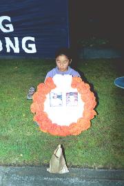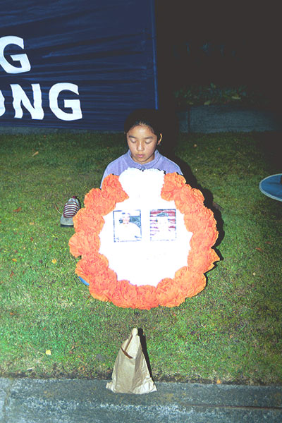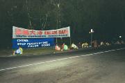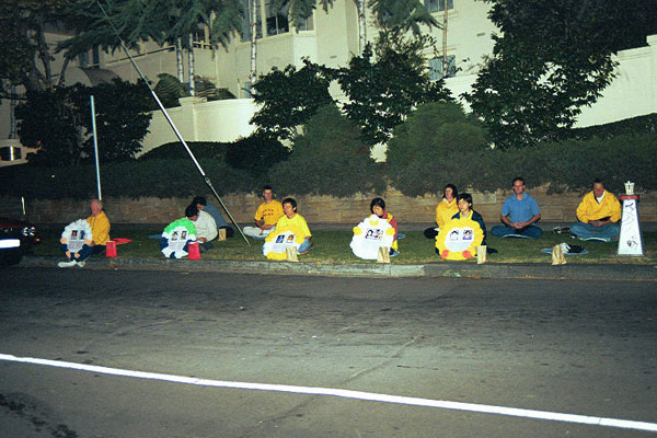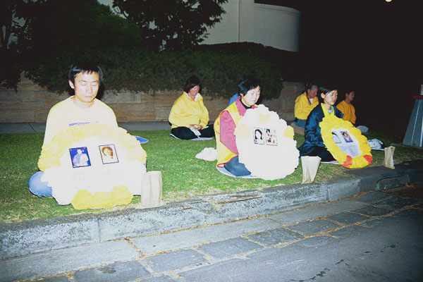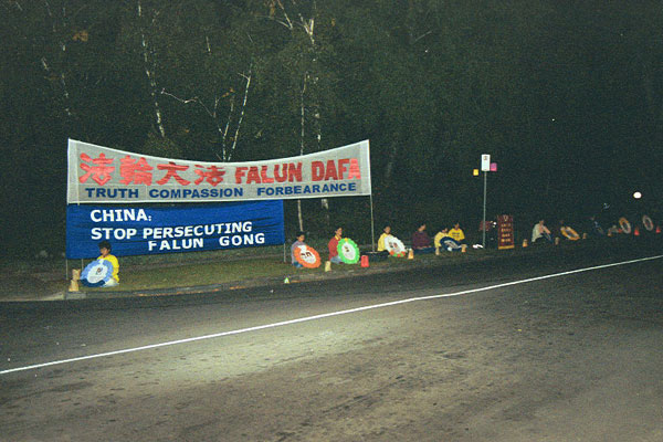 花圈,烛焰,静坐的弟子们在领馆前的马路两边直线拉开,招展于夜风中的各式横幅和普度济世的音乐使夜色更加凝重肃穆。过往的车辆和行人不禁被这庄严的场面所震动,许多人按喇叭表示支持,摇下车窗接过甚至主动索取大法真相材料。学员代表分别用中英文向领馆宣读了我们的公开信。