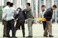 一名妇女和一名男子抱着一个婴儿开始喊法轮功口号。警察卡住那男人的脖子并从他手里夺下孩子。三个人都被塞进了警车。