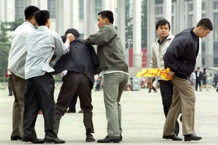 稍后,一名妇女和一名男子抱着一个婴儿开始喊法轮功口号。警察卡住那男人的脖子并从他手里夺下孩子。三个人都被塞进了警车。