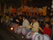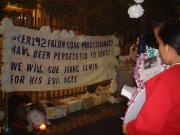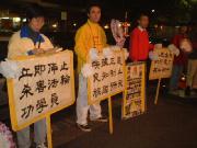 尽管烟雨蒙蒙,一小组法轮功修炼者仍然点燃蜡烛,在繁忙的阿拉穆那,举行烛光守夜。
