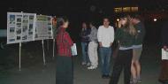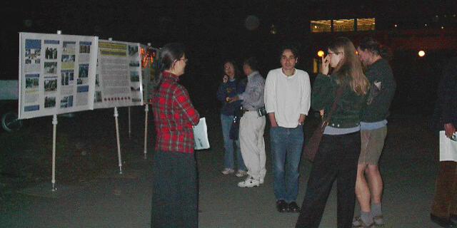 早到的学员在主图书馆前草坪上,架起了黄色的英文“真、善、忍”的大标语。在旁边的草坪上,学员们架起了法轮功真相图片展,简单介绍法轮功的功理功法、在中国和世界各地的广泛传播、邪恶之徒的无耻迫害、学员的大善大忍,吸引了许多行人和学生。此外,学员们还架起一个投影屏幕,反复播放纪录片“2001:向中国呼吁”。学员平和炼功的场面和展板、录像片吸引了很多人驻足观看,有的和学员交谈,有的索取资料,很多人还主动要求签名要求江泽民停止迫害法轮功学员。