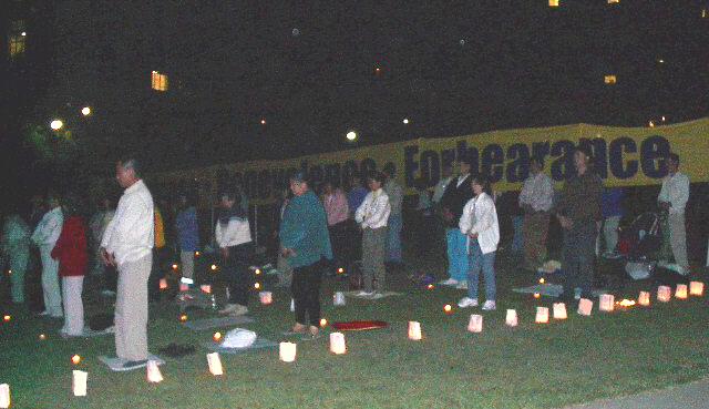 【明慧网2001年4月27日】 怀着对中国大陆学员所承受着的无名苦难的关注,旧金山湾区近一百五十名学员于4月24日傍晚到了加州大学柏克利分校。在柏克利分校的主图书馆前,在徐徐的初夏的微风中,我们点燃了一根根的蜡烛,开始了对两年前的4.25逾万学员到国务院信访办上访请愿这一伟大事件的纪念。