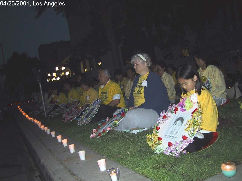 4/25 这天,已习惯于开车的朱丽身着白色长裙,手捧鲜花,仪态端庄而又肃穆,和学员们一起整整行走了两个小时。行走在游行队伍前面的她是那样的引人注目,连过路的许多行人纷纷停下照相,当了解到事实真相时,许多人为她维护人权的壮举而感动地落泪。
