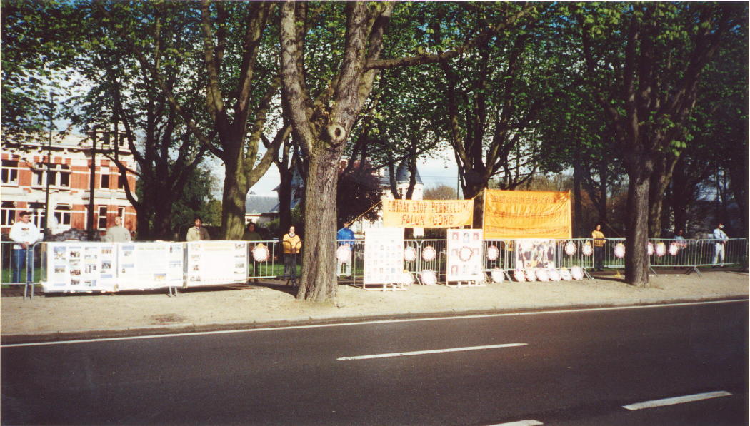 【明慧网2001年4月28日】 四月二十五日下午,比利时的大法弟子相约来到中国大使馆前,纪念两年前的今天,为人类历史写下光辉一页的4.25――万名大法弟子和平上访。弟子们有序地布置着场地,为了这次活动,几位学员特意赶制了两块展板,纪念被江泽民犯罪集团迫害致死的190多位国内同修,其他国家的学员还专程送来了精制的花环,面对使馆,我们拉开了横幅,依次展开了介绍大法及揭露迫害真相的海报。