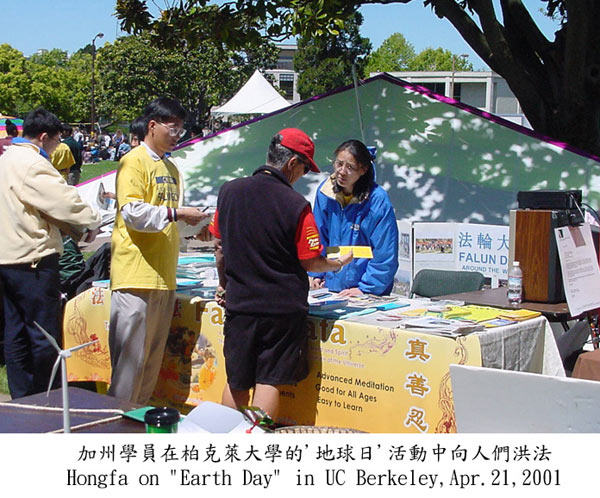 四月二十一日在美国是地球日。湾区柏克莱市举办了一年一度的地球日庆祝活动,约五十多名法轮大法弟子也参加了。清晨,在等待游行开始时,学员们在悠扬的音乐声中炼起了功,吸引了许多游人的围观。旁边的学员于是向人们介绍大法。当游人们了解到大法在中国被的情况,毫不犹豫地拿起笔来签名要求中国政府制止江泽民一夥对法轮功的迫害。也有不少人是因为看了学员炼功后来到法轮功的展位的。他们纷纷表示愿意帮助让更多人了解法轮功,当天就有450多人签名。