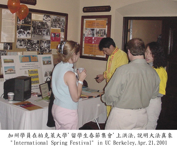 同一天在加州大学柏克莱分校校园内“国际留学生组织”举办了中国春节联谊活动。加大柏克莱分校的学员参加了联谊活动,向师生们介绍法轮功及在中国受到江泽民犯罪集团的迫害的情况。素有支持人权传统的柏克莱学生反映十分热烈。(图为柏克莱学员在向参加活动的游人介绍法轮功。)