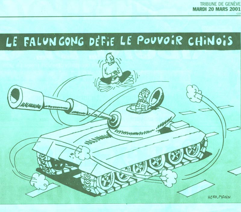 (日内瓦论坛报3月20日漫画,原标题为“法轮功不畏中国政权”。)