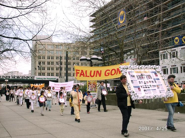 中午学员们在柏林进行了游行。这支队伍在喧闹的市区尤为引人注目。在游行队伍的最前段,两位西人学员庄严地抬着一块围着花环的纪念死难者的大幅图片。紧接着是小弟子们抬着花圈缓缓地走在队伍前排。在队伍中,学员们举着横幅和图片,在“普度”和“济世”的音乐声中,游行队伍缓缓地行进在柏林的中心大街上,气氛异常肃穆庄严。路人被这支宁静的队伍强烈吸引住了。两位从法国来的游客在路旁竖起大拇指对学员说:“法轮功好!”有的开车人专门停下车来向学员要资料。无数行人在街边驻足观看并十分乐意接受学员发的资料。有的主动走向学员来了解真象并表示他们理解和支持学员的行为。