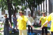 展兴茂,37,江苏省江都市人,去年从江都一分钱未带骑自行车到北京护法,5天到天津,自行车卖了30块钱去了北京。他说:做人就是苦,不就是多吃苦吗?我就是来吃苦的,我坚信,我的师父一定会把我带向圆满。