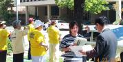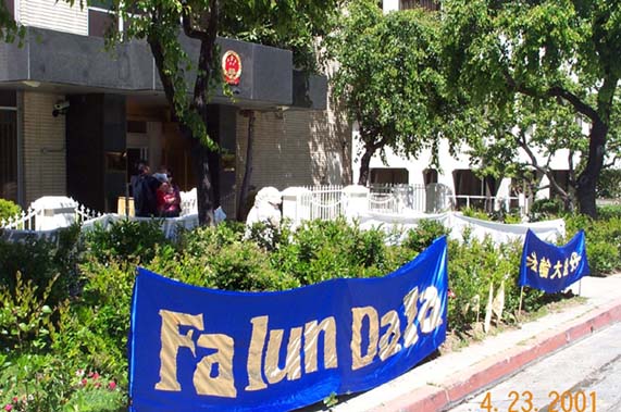 2001年4月25日清晨,两条六米多长的大法条幅悬挂在新华社对面一幢临街的十层居民楼上。金黄色的条幅上写着“还法轮大法清白”几个鲜红的大字,在晨辉中闪闪发光,十分醒目,引起路人啧啧赞叹。