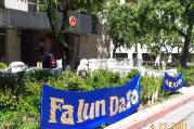 4月25日清晨,北京西城区公安大学司法局东侧的居民楼上也挂出了两条长长的大法条幅,黄底红字,甚为壮观,引来不少行人驻足观看。